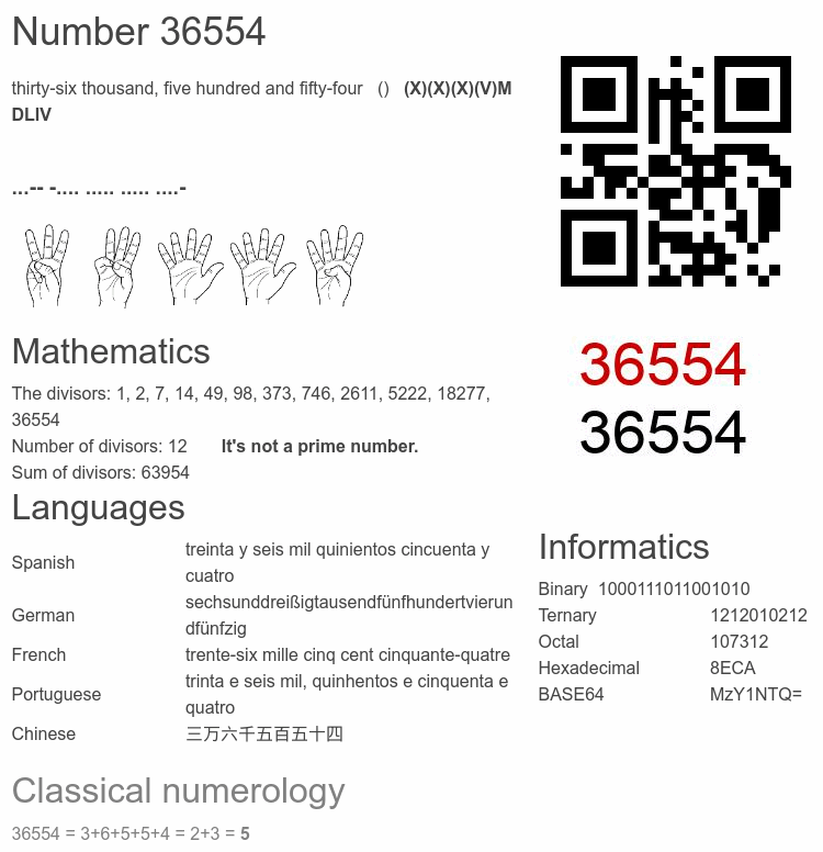 | Spanish: | 🔊 (número 36.554) | treinta y seis mil quinientos cincuenta y cuatro |