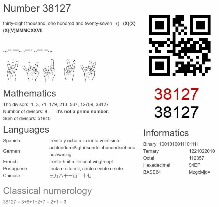 | Spanish: | 🔊 (número 38.127) | treinta y ocho mil ciento veintisiete |
