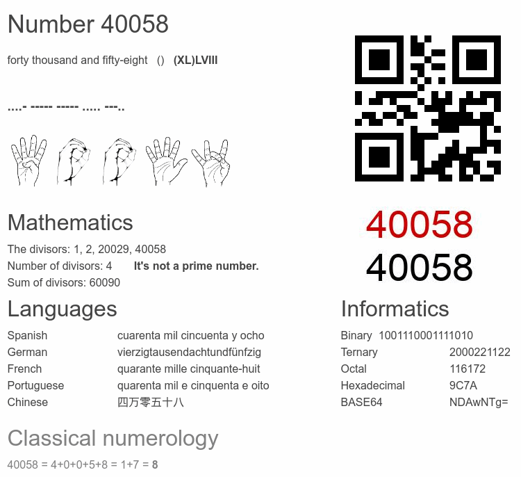| Spanish: | 🔊 (número 40.058) | cuarenta mil cincuenta y ocho |