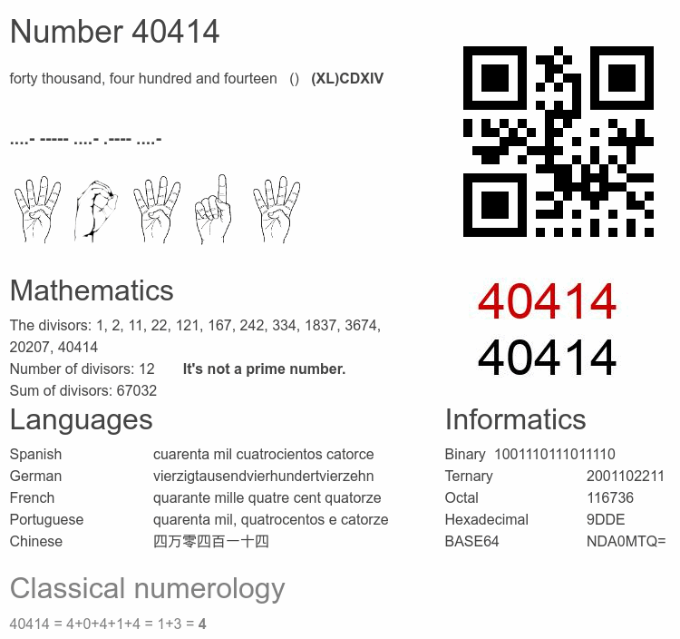 | Spanish: | 🔊 (número 40.414) | cuarenta mil cuatrocientos catorce |