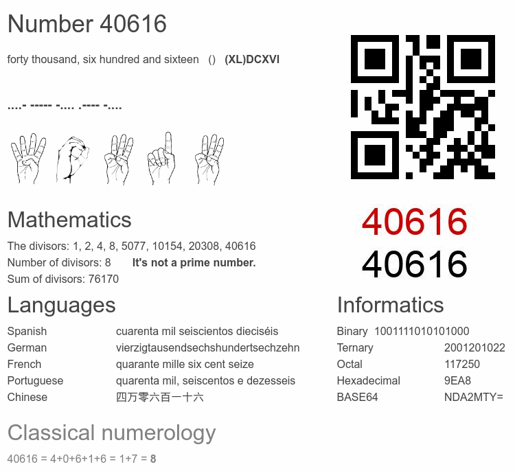 | Portuguese: | 🔊 (número 40 616) | quarenta mil, seiscentos e dezesseis |