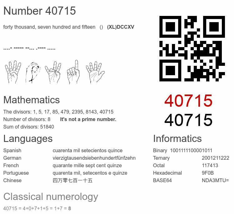 | Spanish: | 🔊 (número 40.715) | cuarenta mil setecientos quince |
