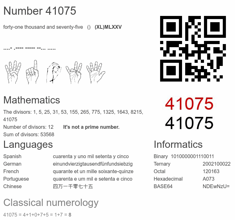 The odd number 41,075 is spelled 🔊, and written in words: forty-one thousand and seventy-five. The ordinal number 41075th is said 🔊 and written as: forty-one thousand and seventy-fifth. The meaning of the number 41075 in Maths: Is it Prime? Factorization and prime factors tree. The square root and cube root of 41075. What is 41075 in computer science, numerology, codes and images, writing and naming in other languages. Other interesting facts related to 41075.