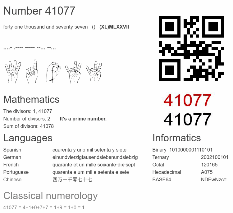 | Spanish: | 🔊 (número 41.077) | cuarenta y uno mil setenta y siete |