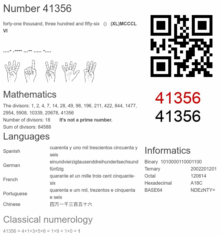 | Portuguese: | 🔊 (número 41 356) | quarenta e um mil, trezentos e cinquenta e seis |
