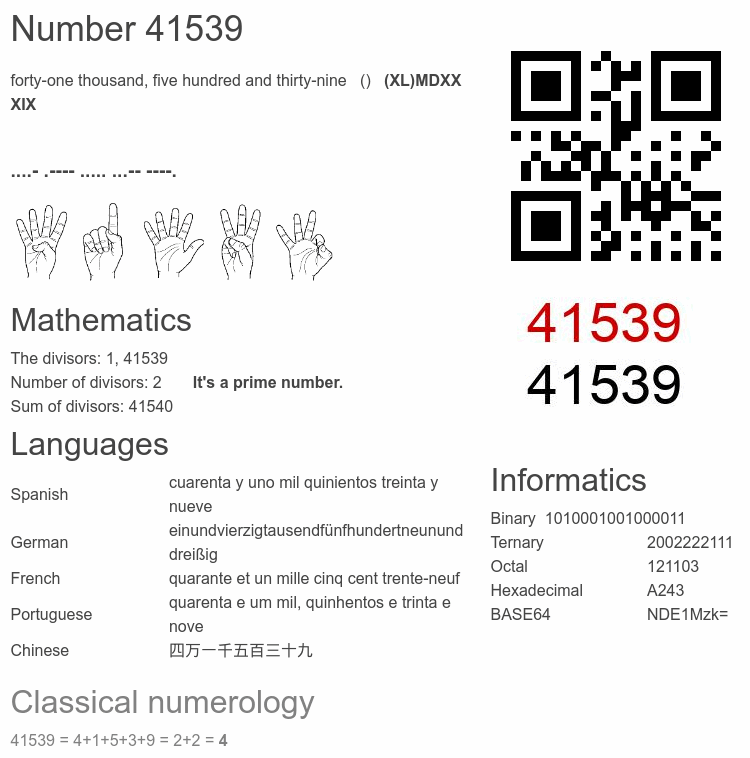 The odd number 41,539 is spelled 🔊, and written in words: forty-one thousand, five hundred and thirty-nine. The ordinal number 41539th is said 🔊 and written as: forty-one thousand, five hundred and thirty-ninth. The meaning of the number 41539 in Maths: Is it Prime? Factorization and prime factors tree. The square root and cube root of 41539. What is 41539 in computer science, numerology, codes and images, writing and naming in other languages. Other interesting facts related to 41539.