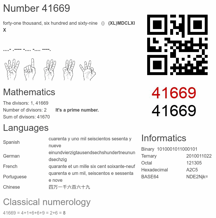 | Spanish: | 🔊 (número 41.669) | cuarenta y uno mil seiscientos sesenta y nueve |