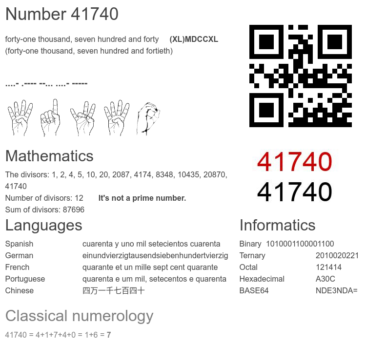 | Spanish: | 🔊 (número 41.740) | cuarenta y uno mil setecientos cuarenta |