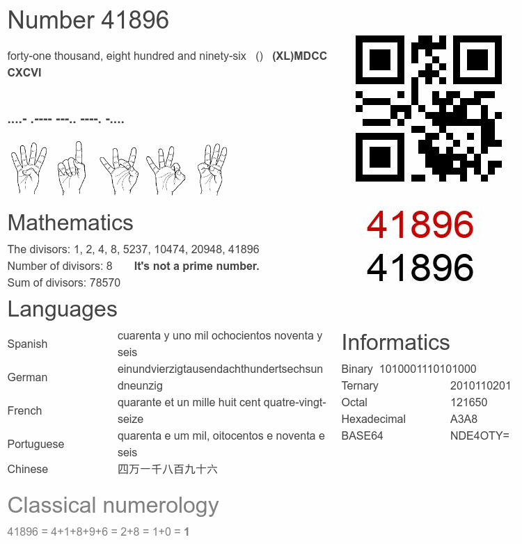 | Spanish: | 🔊 (número 41.896) | cuarenta y uno mil ochocientos noventa y seis |