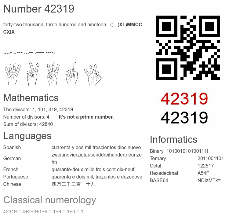 | Portuguese: | 🔊 (número 42 319) | quarenta e dois mil, trezentos e dezenove |
