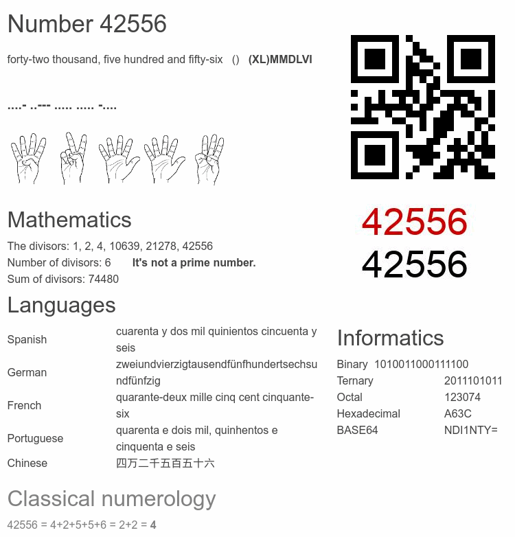 The even number 42,556 is spelled 🔊, and written in words: forty-two thousand, five hundred and fifty-six. The ordinal number 42556th is said 🔊 and written as: forty-two thousand, five hundred and fifty-sixth. The meaning of the number 42556 in Maths: Is it Prime? Factorization and prime factors tree. The square root and cube root of 42556. What is 42556 in computer science, numerology, codes and images, writing and naming in other languages. Other interesting facts related to 42556.