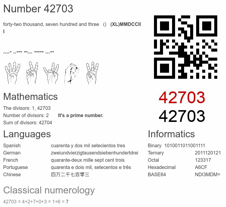 The odd number 42,703 is spelled 🔊, and written in words: forty-two thousand, seven hundred and three. The ordinal number 42703rd is said 🔊 and written as: forty-two thousand, seven hundred and third. The meaning of the number 42703 in Maths: Is it Prime? Factorization and prime factors tree. The square root and cube root of 42703. What is 42703 in computer science, numerology, codes and images, writing and naming in other languages. Other interesting facts related to 42703.