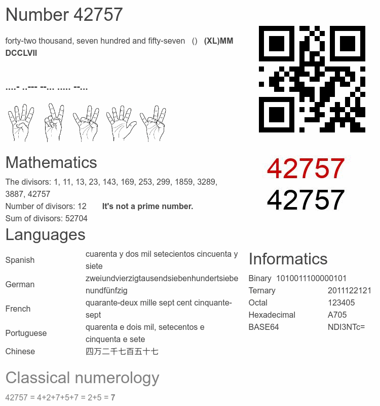 | Spanish: | 🔊 (número 42.757) | cuarenta y dos mil setecientos cincuenta y siete |
