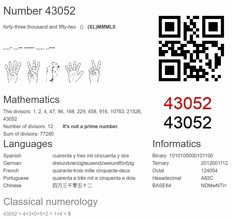 The even number 43,052 is spelled 🔊, and written in words: forty-three thousand and fifty-two. The ordinal number 43052nd is said 🔊 and written as: forty-three thousand and fifty-second. The meaning of the number 43052 in Maths: Is it Prime? Factorization and prime factors tree. The square root and cube root of 43052. What is 43052 in computer science, numerology, codes and images, writing and naming in other languages. Other interesting facts related to 43052.
