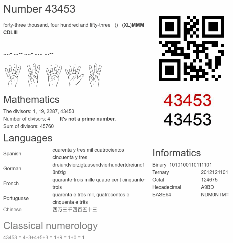 | Portuguese: | 🔊 (número 43 453) | quarenta e três mil, quatrocentos e cinquenta e três |