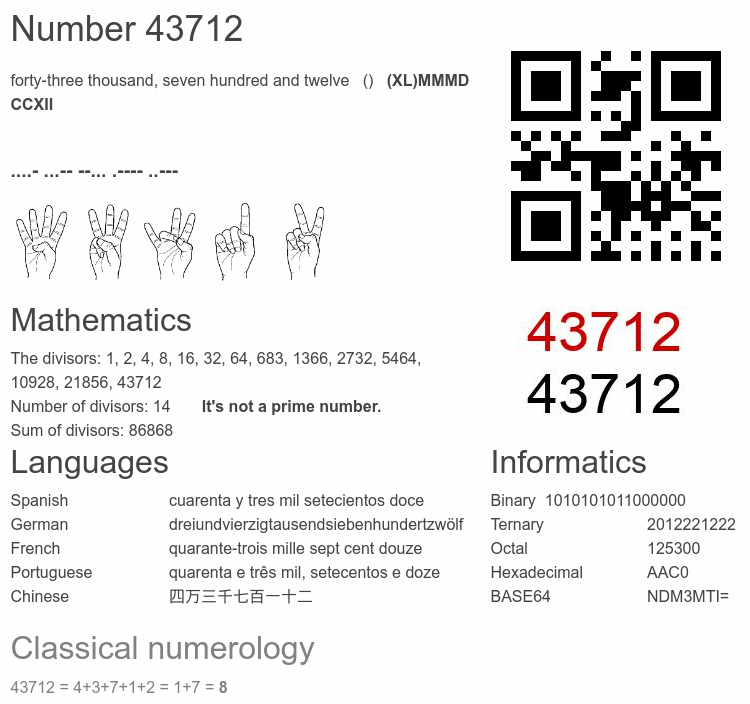 | Portuguese: | 🔊 (número 43 712) | quarenta e três mil, setecentos e doze |