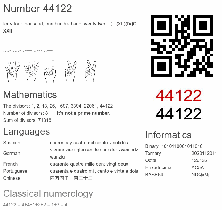 | Spanish: | 🔊 (número 44.122) | cuarenta y cuatro mil ciento veintidós |