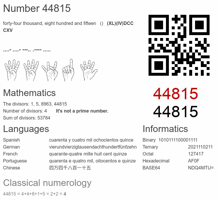 | Portuguese: | 🔊 (número 44 815) | quarenta e quatro mil, oitocentos e quinze |
