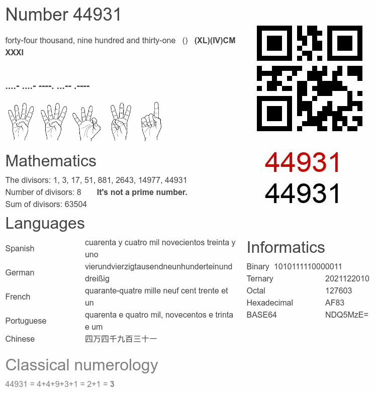 | Portuguese: | 🔊 (número 44 931) | quarenta e quatro mil, novecentos e trinta e um |