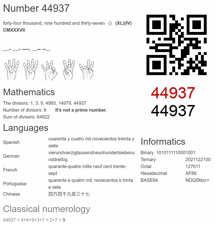 The odd number 44,937 is spelled 🔊, and written in words: forty-four thousand, nine hundred and thirty-seven. The ordinal number 44937th is said 🔊 and written as: forty-four thousand, nine hundred and thirty-seventh. The meaning of the number 44937 in Maths: Is it Prime? Factorization and prime factors tree. The square root and cube root of 44937. What is 44937 in computer science, numerology, codes and images, writing and naming in other languages. Other interesting facts related to 44937.