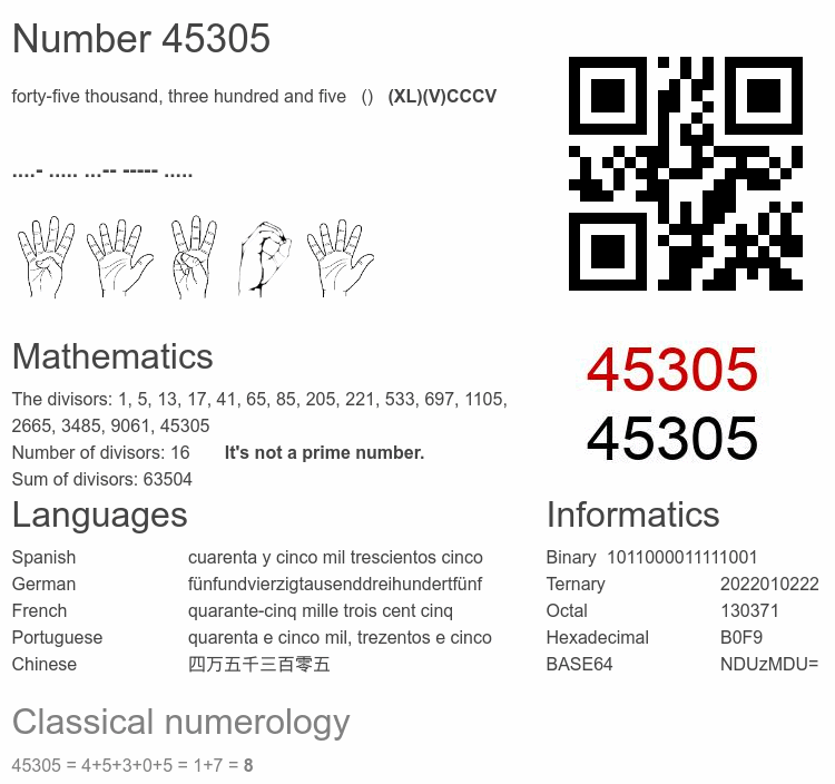| Spanish: | 🔊 (número 45.305) | cuarenta y cinco mil trescientos cinco |