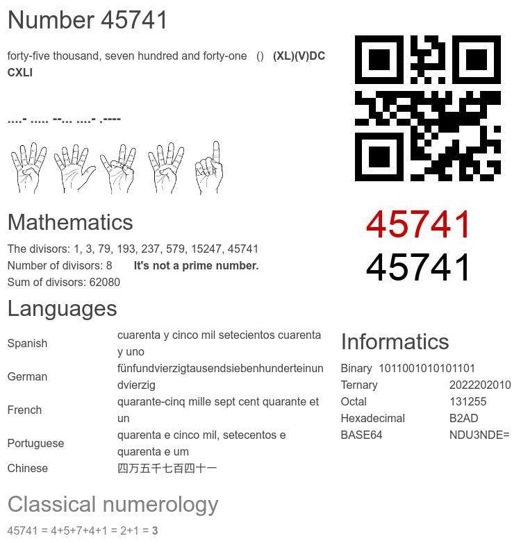 The odd number 45,741 is spelled 🔊, and written in words: forty-five thousand, seven hundred and forty-one. The ordinal number 45741st is said 🔊 and written as: forty-five thousand, seven hundred and forty-first. The meaning of the number 45741 in Maths: Is it Prime? Factorization and prime factors tree. The square root and cube root of 45741. What is 45741 in computer science, numerology, codes and images, writing and naming in other languages. Other interesting facts related to 45741.