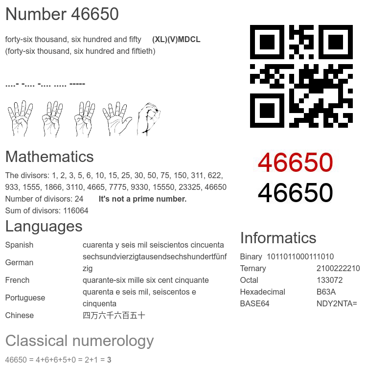 | Spanish: | 🔊 (número 46.650) | cuarenta y seis mil seiscientos cincuenta |