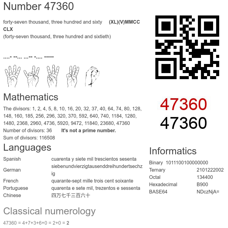 | Spanish: | 🔊 (número 47.360) | cuarenta y siete mil trescientos sesenta |
