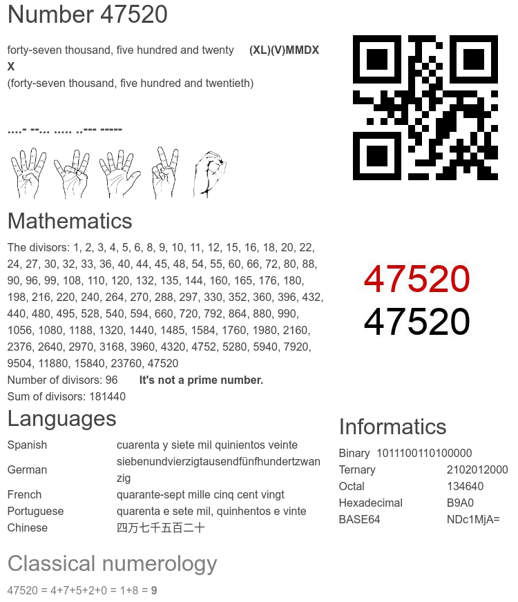| Portuguese: | 🔊 (número 47 520) | quarenta e sete mil, quinhentos e vinte |