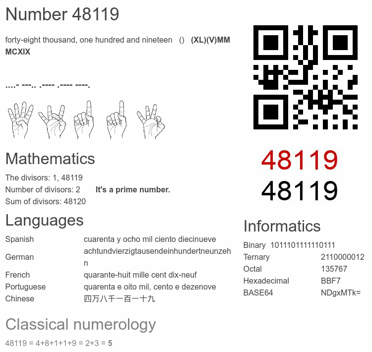 | Portuguese: | 🔊 (número 48 119) | quarenta e oito mil, cento e dezenove |