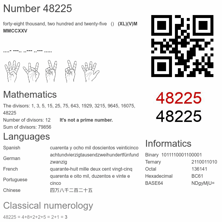 | Portuguese: | 🔊 (número 48 225) | quarenta e oito mil, duzentos e vinte e cinco |