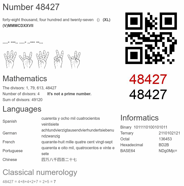 | Spanish: | 🔊 (número 48.427) | cuarenta y ocho mil cuatrocientos veintisiete |