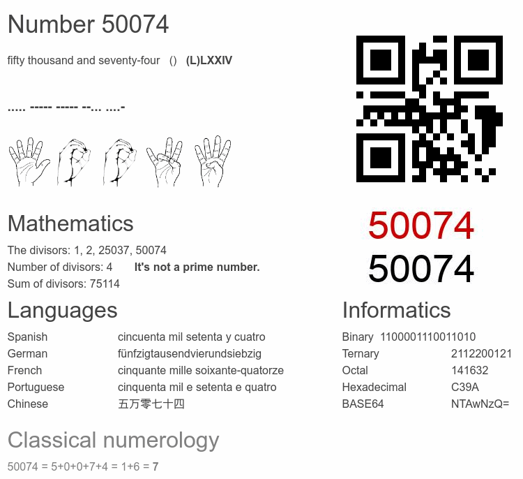 | Spanish: | 🔊 (número 50.074) | cincuenta mil setenta y cuatro |
