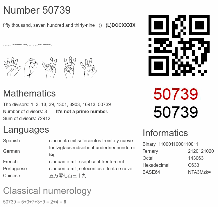 The odd number 50,739 is spelled 🔊, and written in words: fifty thousand, seven hundred and thirty-nine. The ordinal number 50739th is said 🔊 and written as: fifty thousand, seven hundred and thirty-ninth. The meaning of the number 50739 in Maths: Is it Prime? Factorization and prime factors tree. The square root and cube root of 50739. What is 50739 in computer science, numerology, codes and images, writing and naming in other languages. Other interesting facts related to 50739.