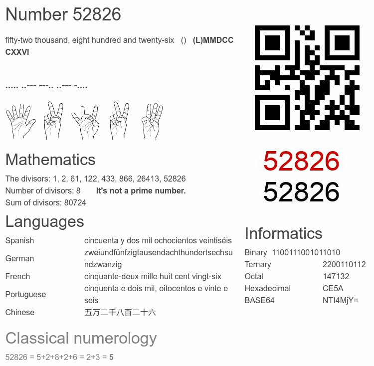 | Chinese: | 🔊 (数 52 826) | 五万二千八百二十六 |
