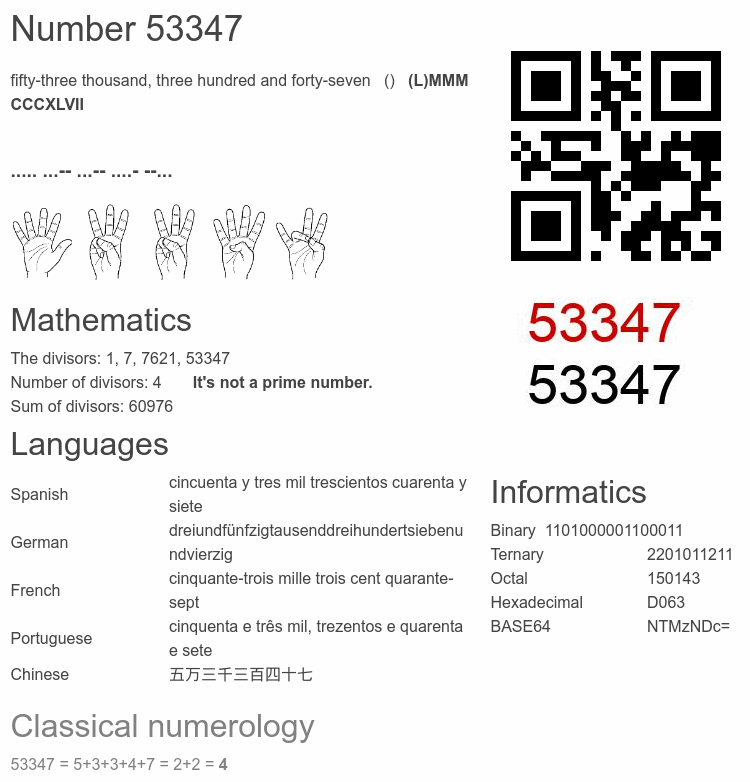 | Spanish: | 🔊 (número 53.347) | cincuenta y tres mil trescientos cuarenta y siete |