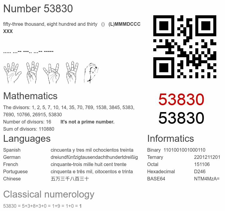 | Spanish: | 🔊 (número 53.830) | cincuenta y tres mil ochocientos treinta |
