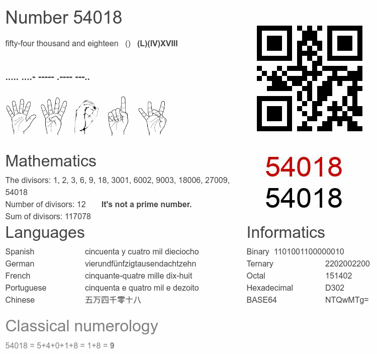 The even number 54,018 is spelled 🔊, and written in words: fifty-four thousand and eighteen. The ordinal number 54018th is said 🔊 and written as: fifty-four thousand and eighteenth. The meaning of the number 54018 in Maths: Is it Prime? Factorization and prime factors tree. The square root and cube root of 54018. What is 54018 in computer science, numerology, codes and images, writing and naming in other languages. Other interesting facts related to 54018.