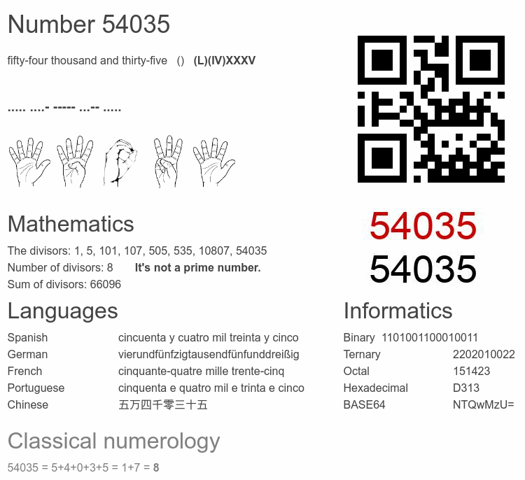 | Spanish: | 🔊 (número 54.035) | cincuenta y cuatro mil treinta y cinco |