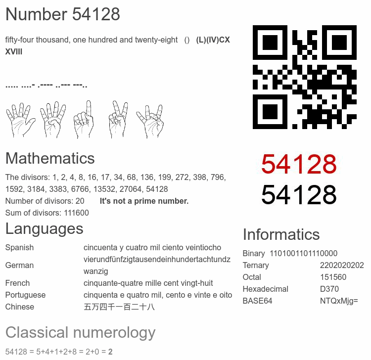 If you know something interesting about the number 54128 or any natural number (positive integer), please write to us.What is 54,128 in other units