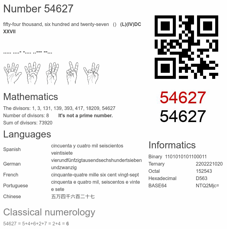 | Chinese: | 🔊 (数 54 627) | 五万四千六百二十七 |