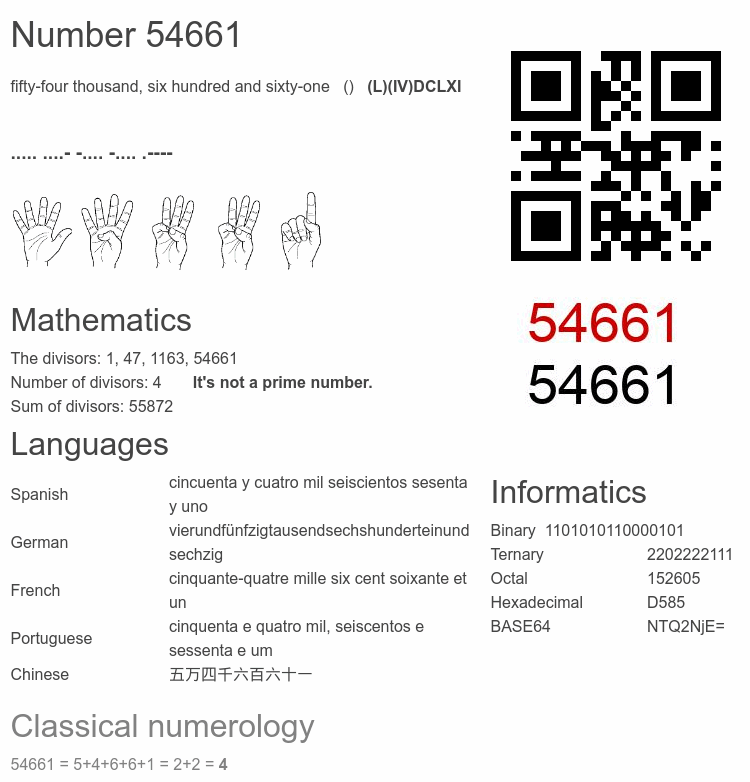 | Ukrainian: | 🔊 (номер 54 661) | п'ятдесят чотири тисячі шістсот шістдесят один |