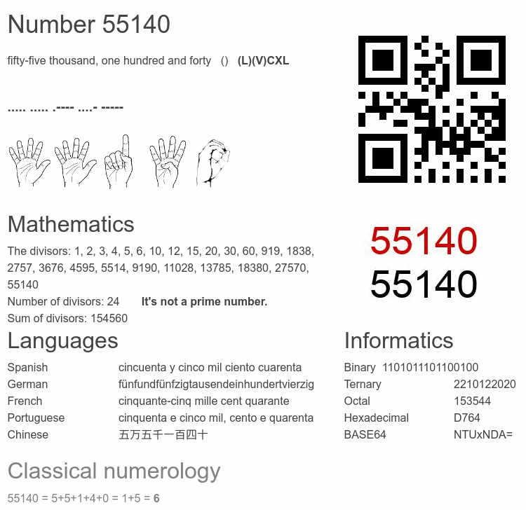 The even number 55,140 is spelled 🔊, and written in words: fifty-five thousand, one hundred and forty. The ordinal number 55140th is said 🔊 and written as: fifty-five thousand, one hundred and fortieth. The meaning of the number 55140 in Maths: Is it Prime? Factorization and prime factors tree. The square root and cube root of 55140. What is 55140 in computer science, numerology, codes and images, writing and naming in other languages. Other interesting facts related to 55140.