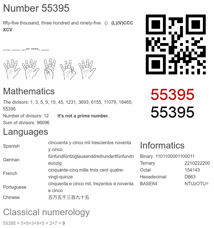 | Spanish: | 🔊 (número 55.395) | cincuenta y cinco mil trescientos noventa y cinco |