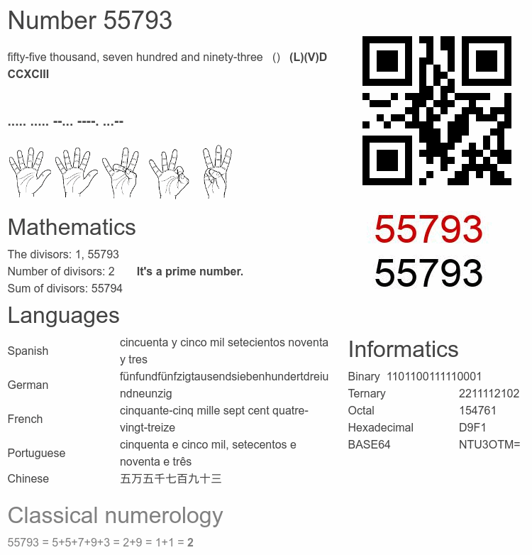 | Arabian: | 🔊 (عدد 55,793) | خمسة و خمسون ألفاً و سبعمائةثلاثة و تسعون |