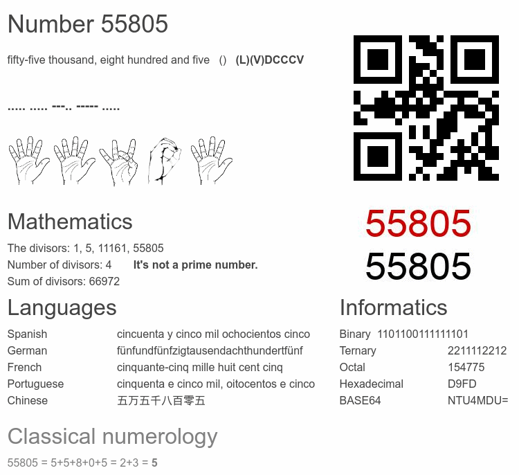 | Spanish: | 🔊 (número 55.805) | cincuenta y cinco mil ochocientos cinco |