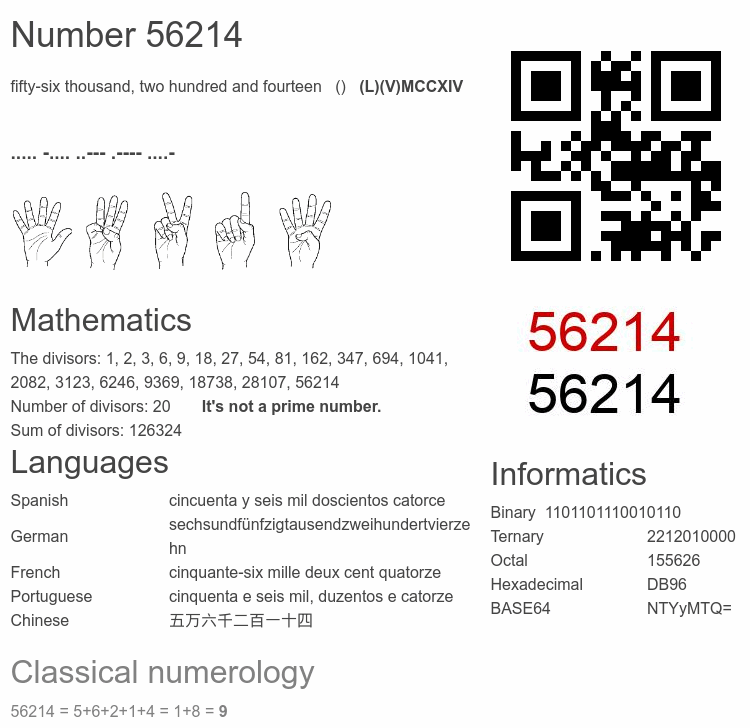 | Spanish: | 🔊 (número 56.214) | cincuenta y seis mil doscientos catorce |
