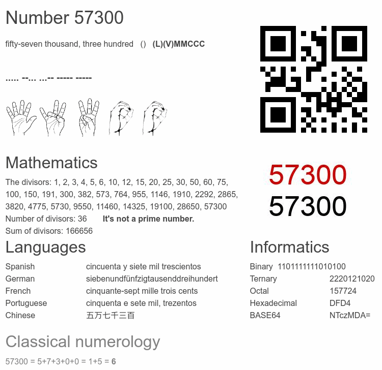 The even number 57,300 is spelled 🔊, and written in words: fifty-seven thousand, three hundred. The ordinal number 57300th is said 🔊 and written as: fifty-seven thousand, three hundredth. The meaning of the number 57300 in Maths: Is it Prime? Factorization and prime factors tree. The square root and cube root of 57300. What is 57300 in computer science, numerology, codes and images, writing and naming in other languages. Other interesting facts related to 57300.