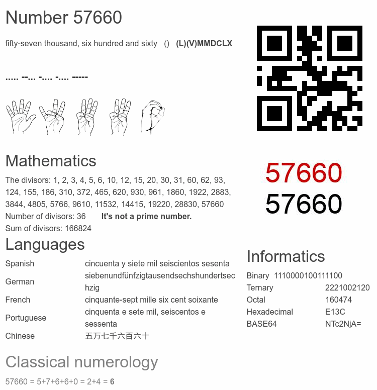 | Spanish: | 🔊 (número 57.660) | cincuenta y siete mil seiscientos sesenta |