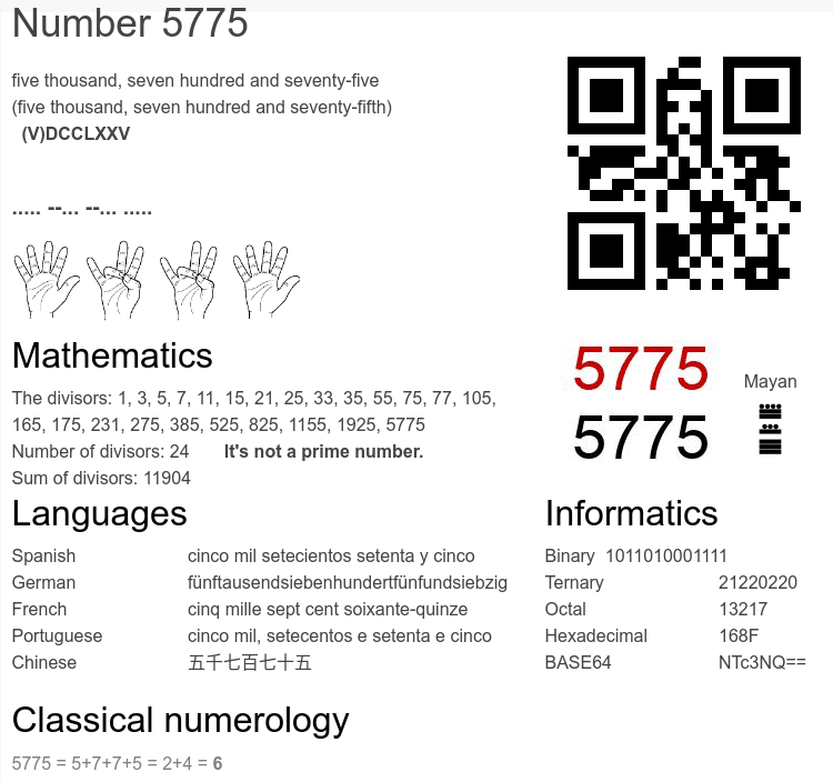 | Spanish: | 🔊 (número 5.775) | cinco mil setecientos setenta y cinco |